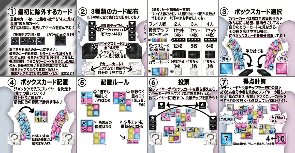 ゲームの流れはシンプルで、簡単にお伝えすると、≪カード配布≫→≪カード配置≫→≪相手の色を投票≫、の3つの流れで1ゲームとなります。
