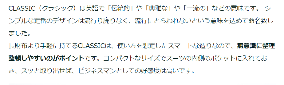 CLASSICの重さはわずか43gで厚さは1cm未満。ジーンズのポケットなどに長時間入れていてもストレスを感じません。お尻のポケットから片手でサッと出せる動線の良さは魅力的です。
