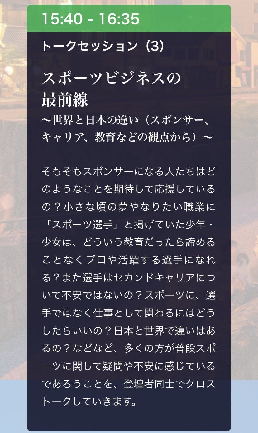 2019/07/07 07:24【当日のトークセッションテーマ紹介】スポーツビジネスサミット当日の、セッションテーマおしらせ最終です!--------------------------テーマ「スポーツビジネスの最前線 〜世界と日本の違い(スポンサー、キャリア、教育などの観点から)〜」そもそもスポンサーになる人たちはどのようなことを期待して応援をしているの?小さな頃の夢やなりたい職業に「スポーツ選手」と掲げていた少年・少女は、どういう教育だったら諦めることなくプロや活躍する選手になれる?また選手はセカンドキャリアについて不安ではないの?スポーツに、選手ではなく仕事として関わるにはどうしたら良いの?日本と世界で違いはあるの?などなど、多くの方が普段スポーツに関して疑問や不安に感じているであろうことを、登壇者同士でクロストークしていきます。------------------------スポーツ選手に必ず付いて回る話として「キャリア」があります。グロービスさんの画期的な取組も始まりますが、このような支援的な取組のみならず、日本においてスポーツはどのように考えていけば良いのか?周辺ビジネスに関わっている、もしくはこれからスポーツに関わっていきたい人たちは何を学んで行動していけば良いのか?世界と日本の比較など、示唆に富んだ話をたくさん聞けるはずです。 もっと見るトークセッション紹介 ②