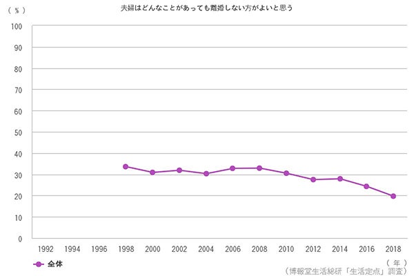 下のグラフは、「夫婦はどんなことがあっても離婚しない方がよいと思う」という質問に、初回調査の1998年(平成10年)には33.6%だったものが、昨年2018年(平成30年)には、19.7%と過去最低になっています。