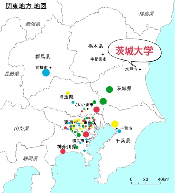 関東リーグに属する大学の所在地が各々どのくらい離れているか、地図で比較してみました。
