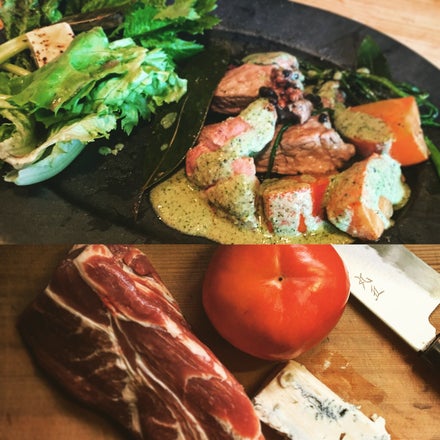 これは豚肉の旨味、ブルーチーズの塩味、脂肪、柿の酸味、甘味で完璧な料理に