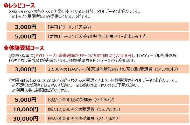 AYUとSakura cookのクラスの詳細(時間帯、金額など)はWebサイトでご確認のうえ、事前予約をお願いいたします。