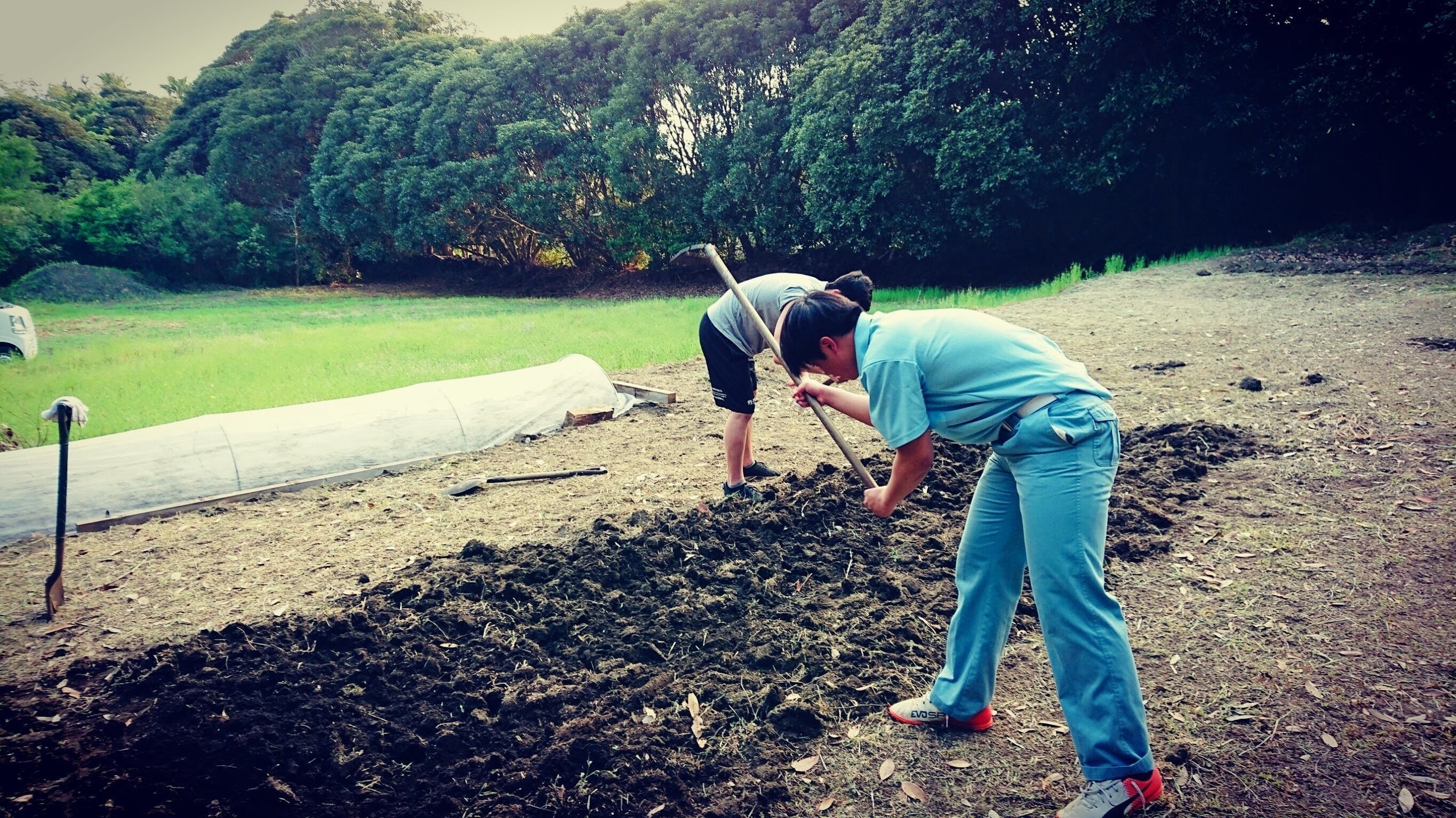 (三原山 ブルーヘイズ農場の平山さんに説明を受けながら、馬糞の堆肥を頂きました。ありがとうございました!)