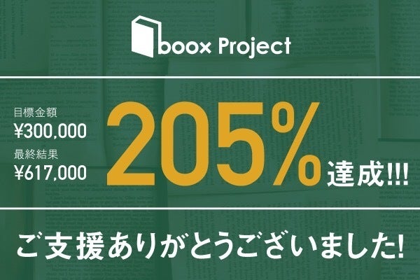 2019/07/06 22:00BOOXを応援してくださっている皆様へ。BOOXサポートメンバーの川西です。いつも応援ありがとうございます。ご報告が遅くなってしまい大変恐縮ですが、6/29 23:59をもって私たちBOOXのクラウドファンディングが終了いたしました。そして結果は、、、・・108名の方からあたたかいご支援をいただき、目標の205%となる617,000円を集めることができました!!!ネクストゴール60万円を無事に達成することができました。応援いただいた皆さまのおかげです。本当にありがとうございました。BOOXは7月から、 東京に拠点を構える準備と、オンラインコミュニティの立ち上げの準備を進めていきます。また、支援者の皆さまのリターン(シールや栞、トートバッグ等)も順次制作を開始していきたいと思います。改めて、この度は私たちのプロジェクトにご支援いただき、本当にありがとうございました。引き続き、BOOXをどうぞよろしくお願いいたします! もっと見る【メンバーの想い】Yusuke Matsuura「BOOXに集まってくれる皆さんが “主役” です」