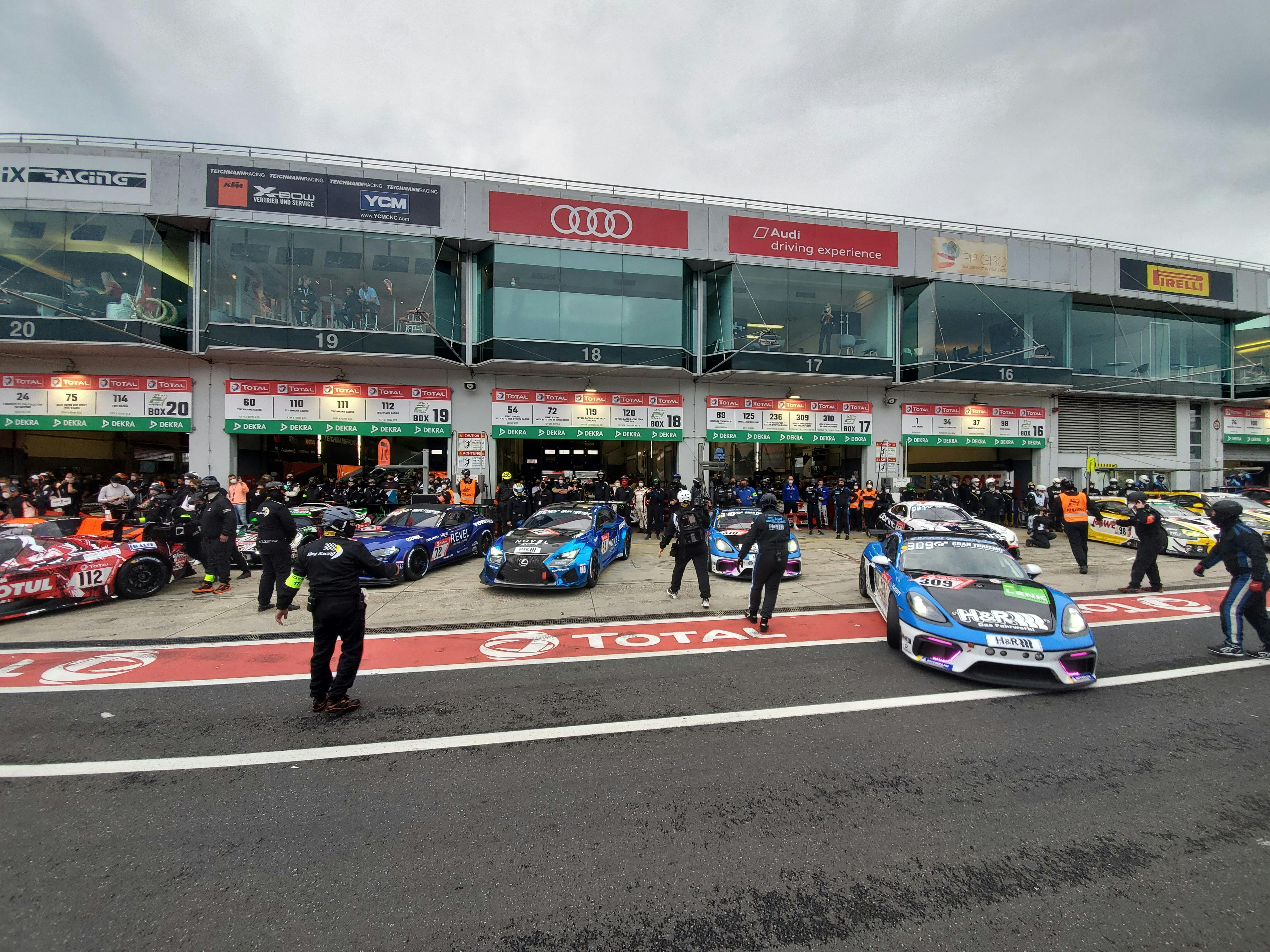 通常ニュルの夜走行は暗闇に包まれ非常にデンジャラスな環境になります。しかし、日の長いこの時期のドイツでは夜10時でもまだ日本の夕焼けレベル。午後までの雨もやみまだ日が残る中良い環境で最後はスリックでのアタックになりました。
