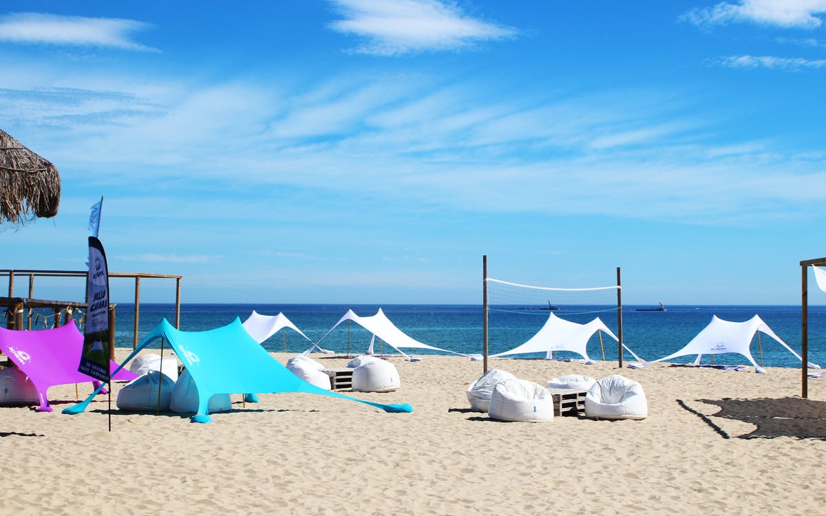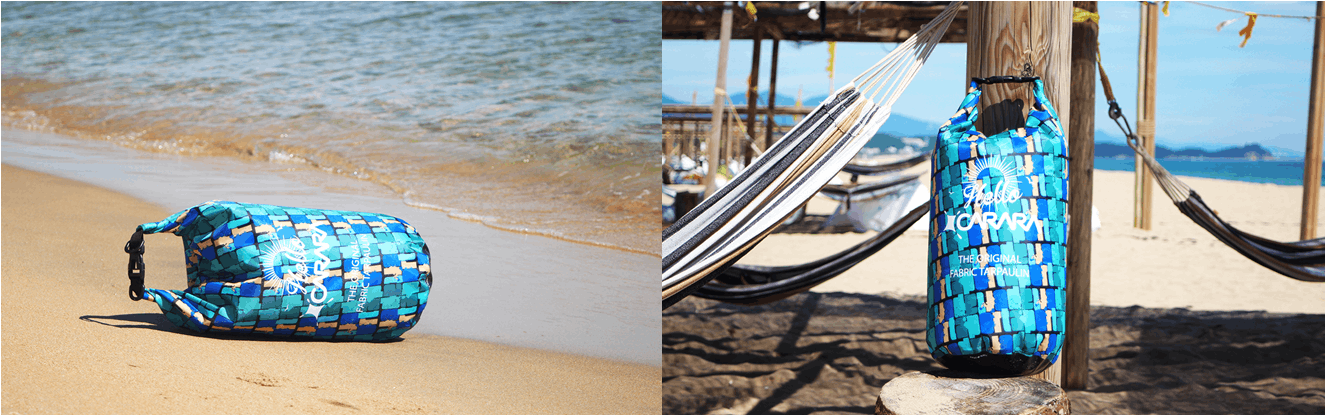 タープの収納バッグとして防水機能を備え、ビーチバッグとして利用可能な2 in 1機能で濡らしたくないタオルや貴重品を入れて海へGO!!