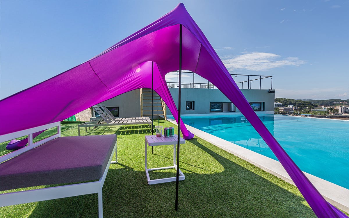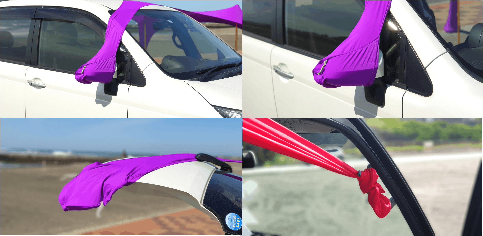 悩んだ結果、私と妻が着ていたラッシュガードを木に縛って子供に小さな陰を作りました。その時ふと「伸縮性が良く、紫外線もブロックされるラッシュガード素材でタープを作ればどうか?」アイデアが浮かびました。