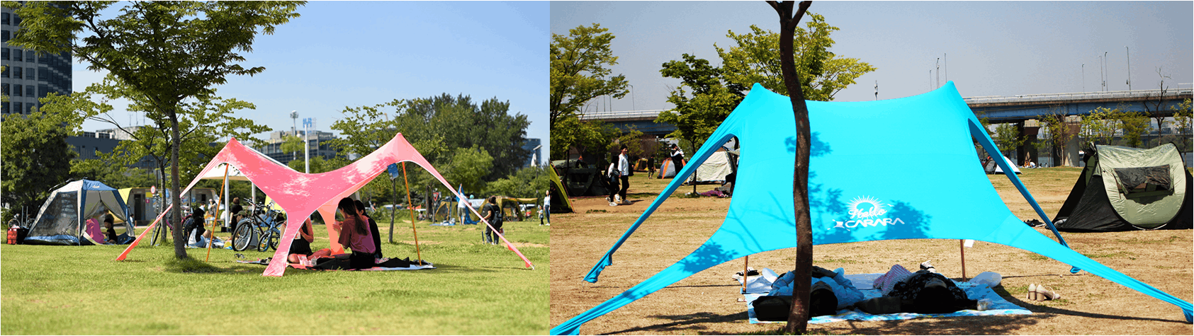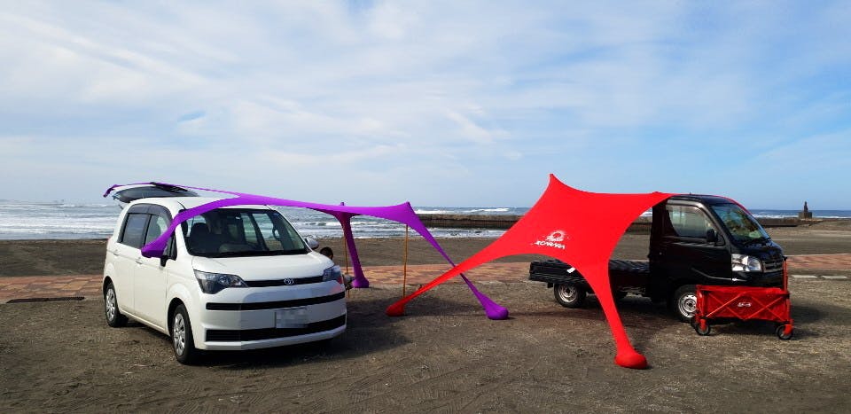今までは無彩色で重く感じるテントやタープを持って外出していませんか?強い風に飛びそうな時、向きを変え場所を変え,,, 砂浜では、ピンで固定しても何度も飛んでしまう事がありませんでしたか?