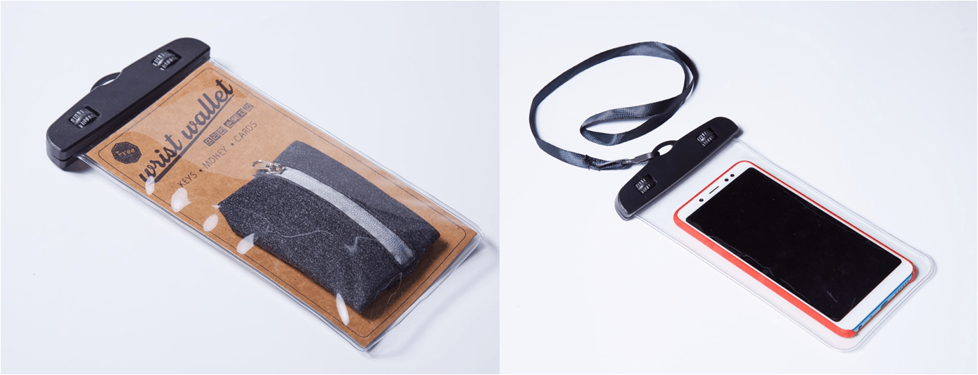 リストバンド型財布の梱包材も環境を考えて、携帯やタバコ入れに使用出来る防水ケースにしました。梱包材を捨てずに活用してください。