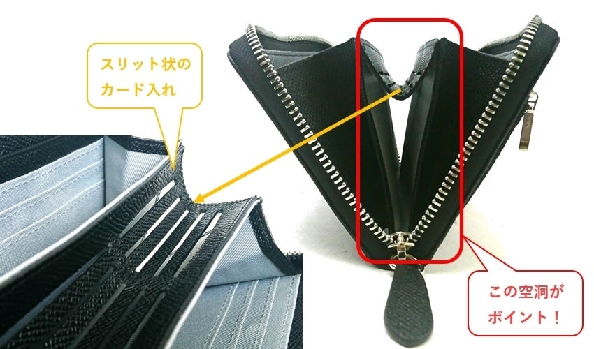 この独自の空洞構造があること。つまり余計な材料を使っていません。そのためカードをたくさん入れてもかさばらず、財布がすっきりとスマート「薄くてスタイリッシュ」なのです。