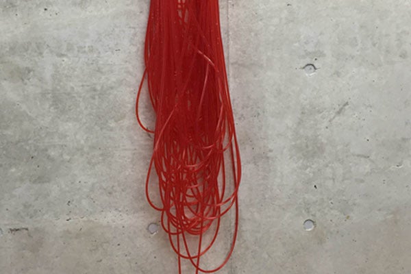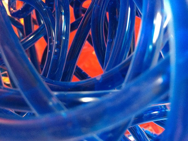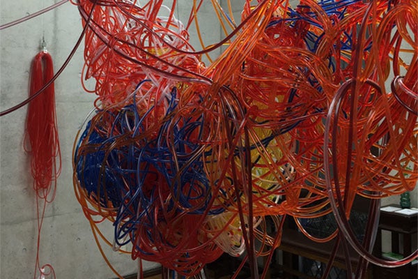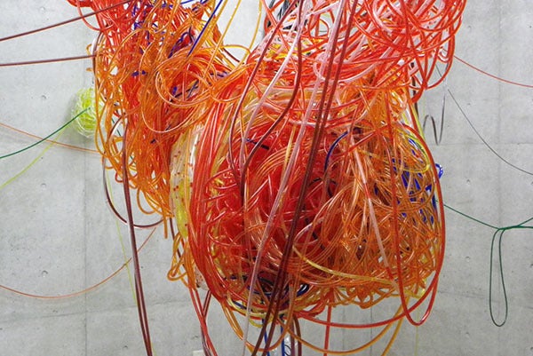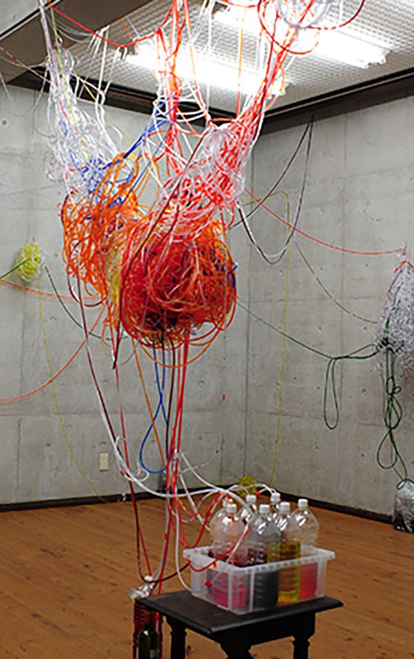 素材は医療用などに使う、直径が3~6㎜の透明チューブです。このチューブ約2㎞を編み上げて立体物を作り、パフォーマンスとしてそこに色水を、わたしが吸い上げます。簡単に言えば一本が100メートルのストローにジュースが入っていく感じですね⁉
