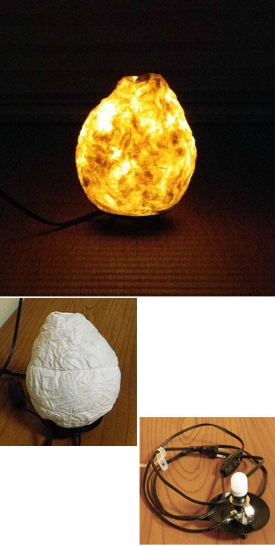 このランプシェードは、2018年に奈良のギャラリー勇斎で展示したものです。熊本県水俣市にある紙漉き工房「水俣浮浪雲工房」から楮(こうぞ)のパルプを提供していただき、特殊な技術により立体的にパルプを成形して作りました。したがって竹や針金などの骨組みはなく、和紙だけで立体構造を作っています。