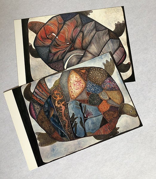 絵葉書の2枚セットとお礼の手紙です。絵葉書の絵は私が1990年にペンと水彩で描きました。タイトルは「閉じ込められたカメ」の裏と表です。 100人