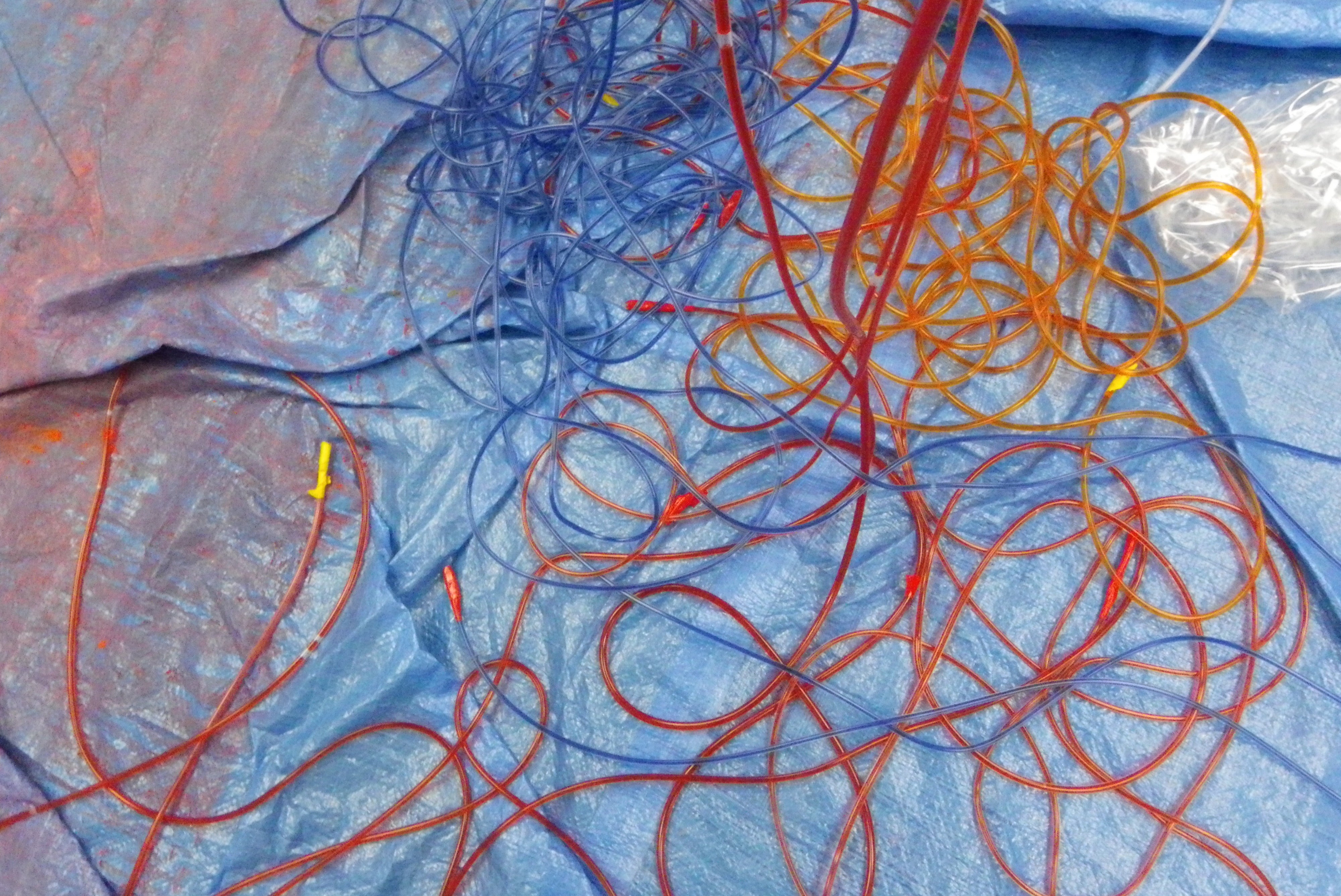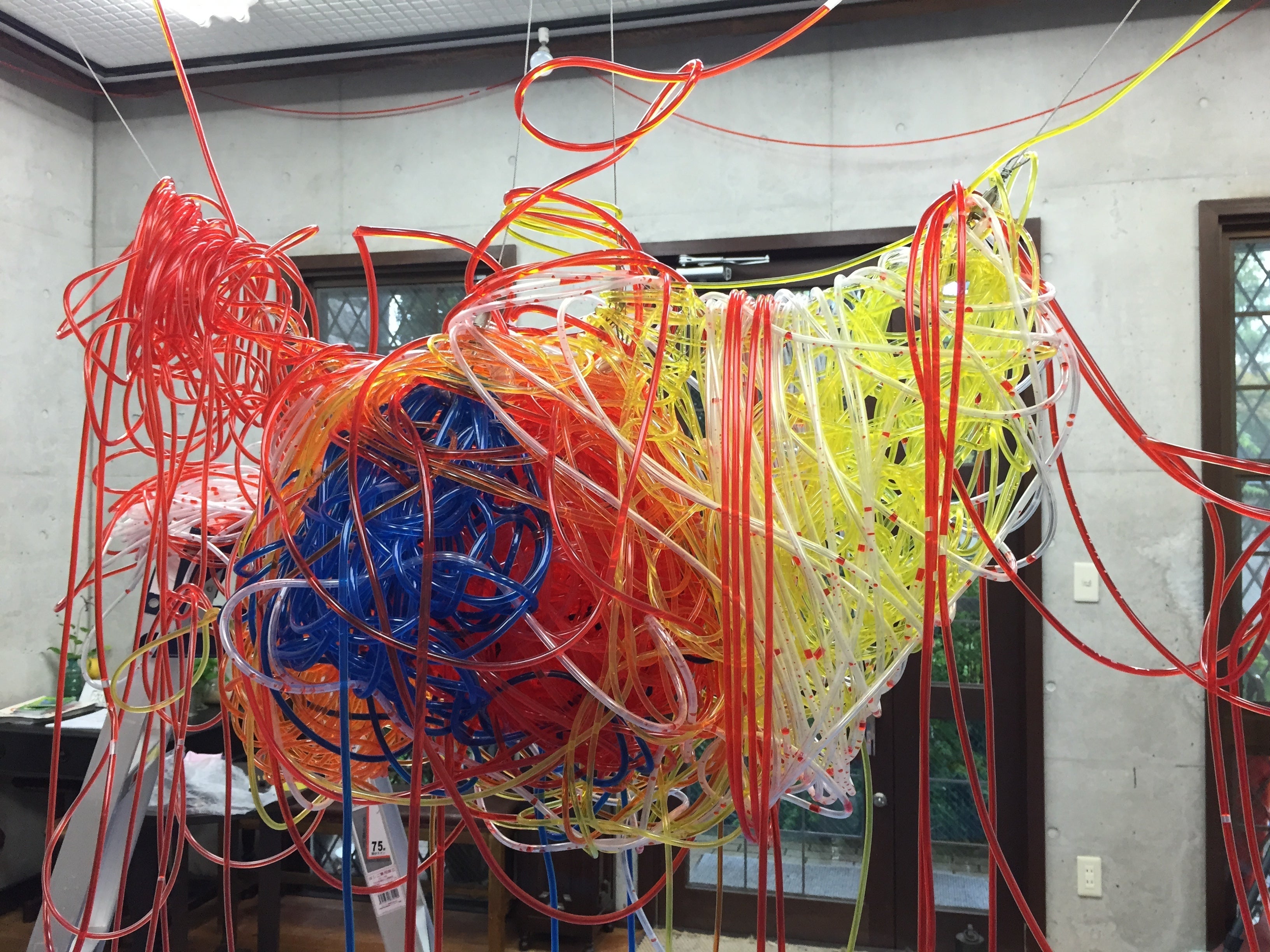 特に面白いのは色水を入れるところです!わたしもこの瞬間はワクワクします。なにせ、チューブは複雑に編みあげられています。色がどのようなルートを走っていくかはわたしにもわかりません。これをデンマークの人は面白がってくれることと期待しています。ギャラリーの近くには幼稚園もあるので、子供らも見に来てくれるといいな!