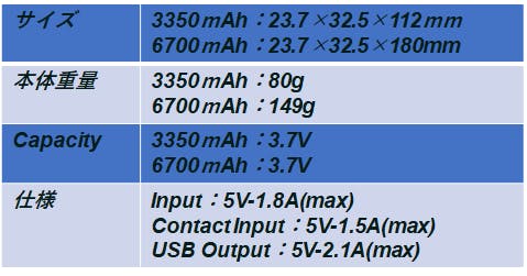 容量は「3350mAh」と「6700mAh」の2種類があります。小旅行なら1本で充分。