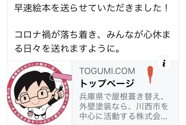 2020/05/21 16:15【協賛会社様のご紹介】兵庫県川西市にある、株式会社 と組 代表福田雄様より協賛のお申し出があり、絵本 30冊と協賛金をご支援いただきました。ありがとうございました。となりのりふぉーむ君株式会社 と組http://www.togumi.com/兵庫県保育協会の賛助会員をされていて、同県内の病院・保育所等にお配りいただけるとのことで、嬉しいです。早速絵本を送らせていただきました!コロナ禍が落ち着き、みんなが心休まる日々を送れますように。 もっと見る