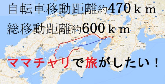 思い付きで初めて見たものの距離を計算してみるとなんと総移動距離なんと約600㎞でした。大阪-東京間よりも長い・・・ そのうち自転車での移動距離は約470㎞!? 大阪から横浜ぐらいの距離でしょうか? そう思うと不安が押し寄せてきました。 でも自転車旅がやりたい! もしよろしければご支援お願いします。 自転車での総移動距離約470㎞ 内訳 大阪ー神戸 約25㎞ 高松ー高松市立峰山公園キャンプ場 約6㎞ 高松市立峰山公園キャンプ場ーイオンモール綾川 約18㎞ イオンモール綾川ーイオンモール今治新都心 約115㎞ イオンモール今治新都心-尾道市(しまなみ海道) 約66㎞ 尾道市-大阪 約240㎞ 船での総移動距離約130㎞ 神戸ー高松 約130㎞
