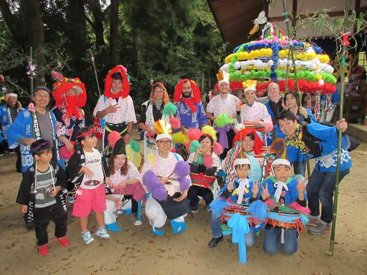 * 秋の例大祭。3日間の楽打ちの練習もご苦労様。国際ワークキャンプ美郷のメンバーや村の子供達と *