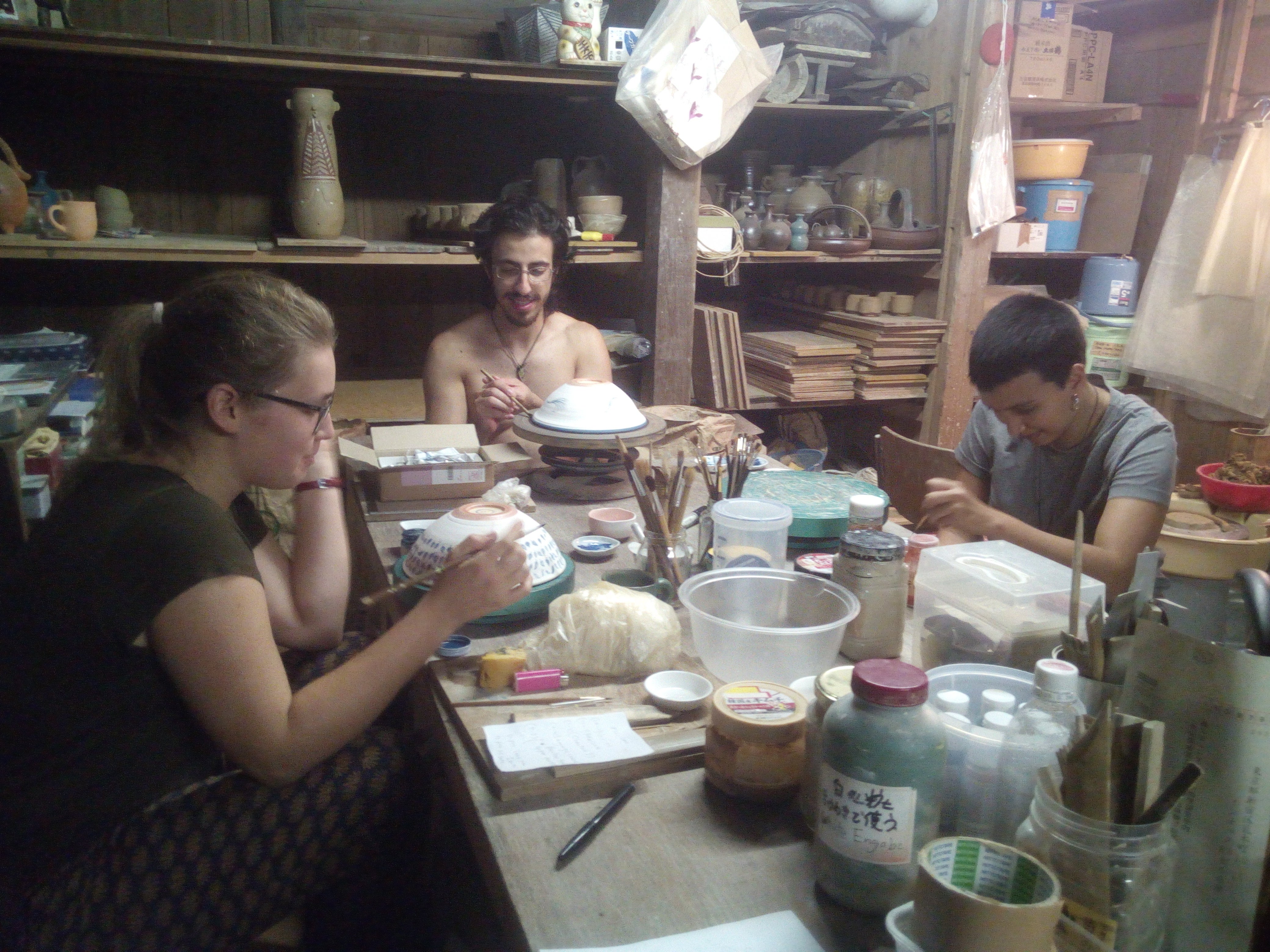 * 工房で作陶に励むブラジルの若者達3人。日系ブラジル人のカズエの向かいには香港から来た友人も *