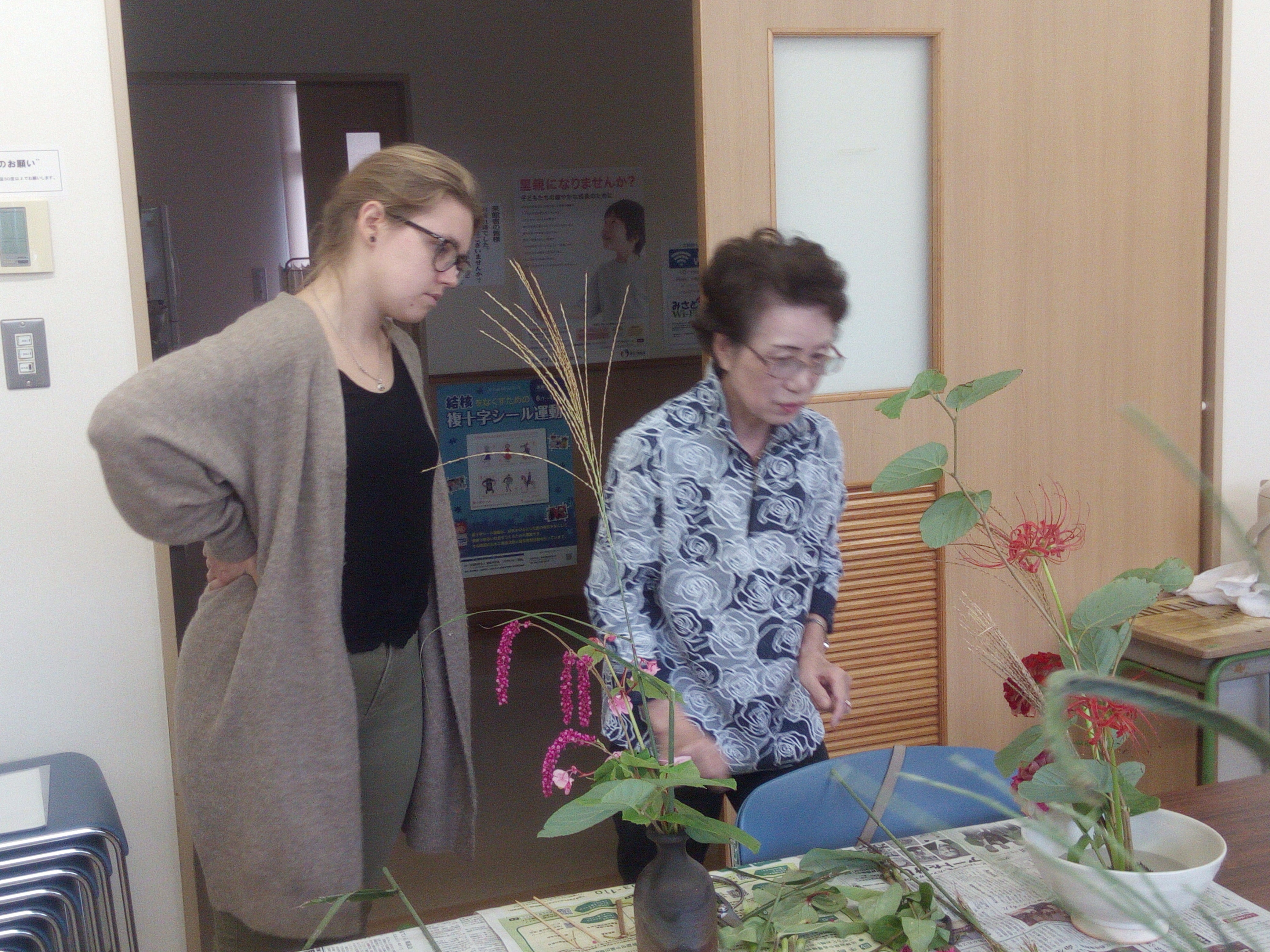 * 吉田とよ子先生が毎年生け花指導をしてくださいます。ユラーテは筋がいいそうですが ? *