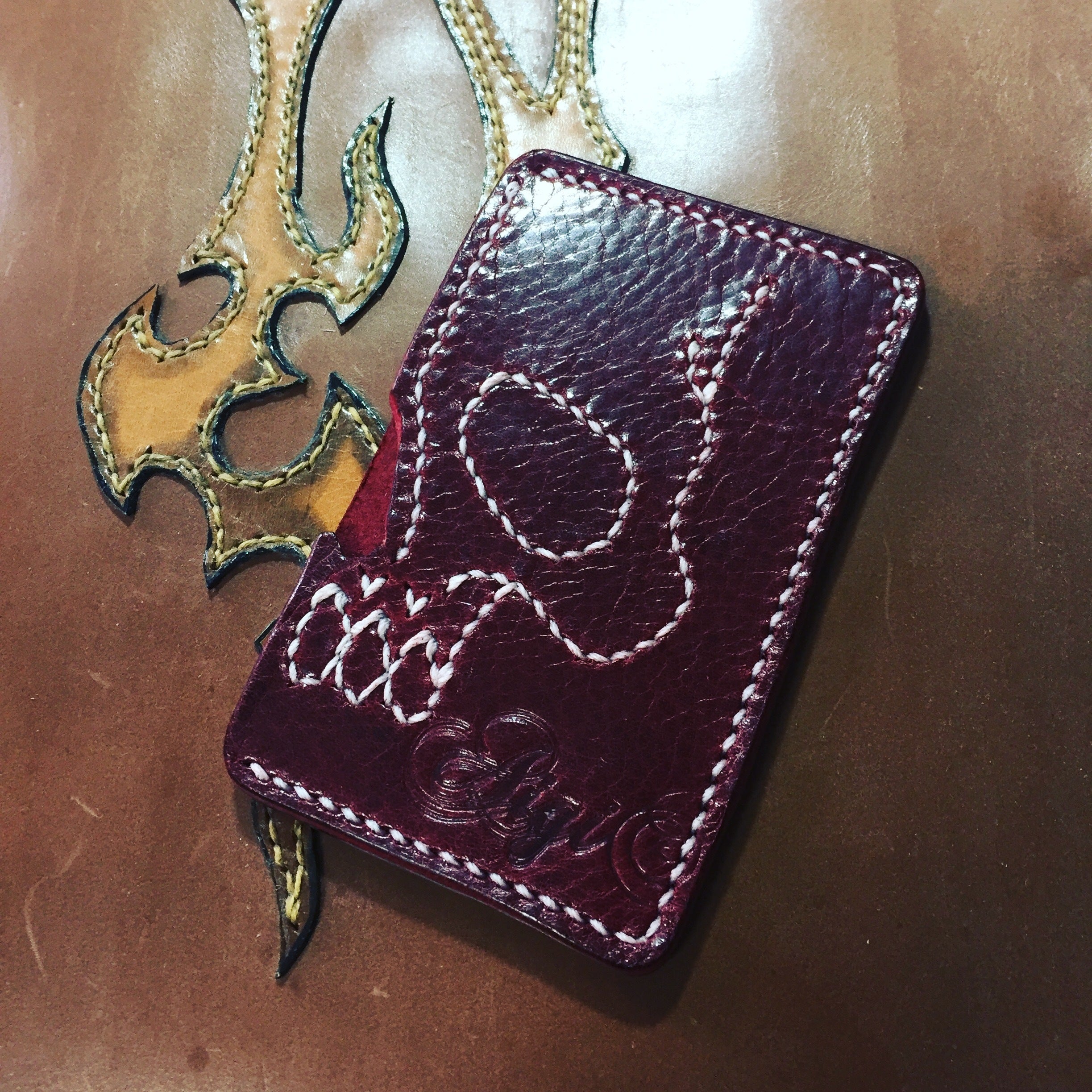シンプルな形状のパスケースにドクロをフリーハンドで縫いました。
