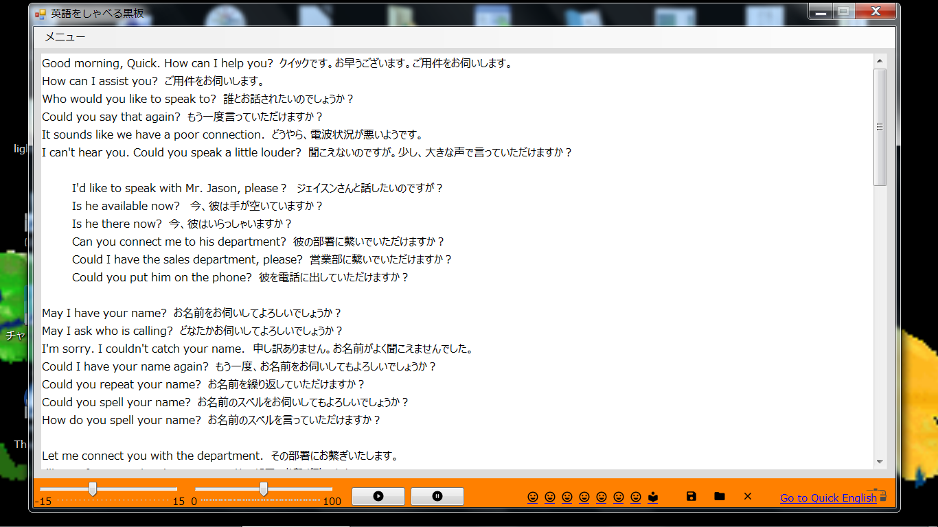 ・英語をしゃべる黒板(白板にもできます) 黒板内の情報(英文法の説明・構文の説明・英単語ー初級から中級まで)を黒板に表示、PCで保存した情報を黒板に表示、また黒板上で文字(英語と日本語)を書いたり、編集や保存をすることができます。コピー&ペーストもできます。それらの英文を読み上げます(合成音)。