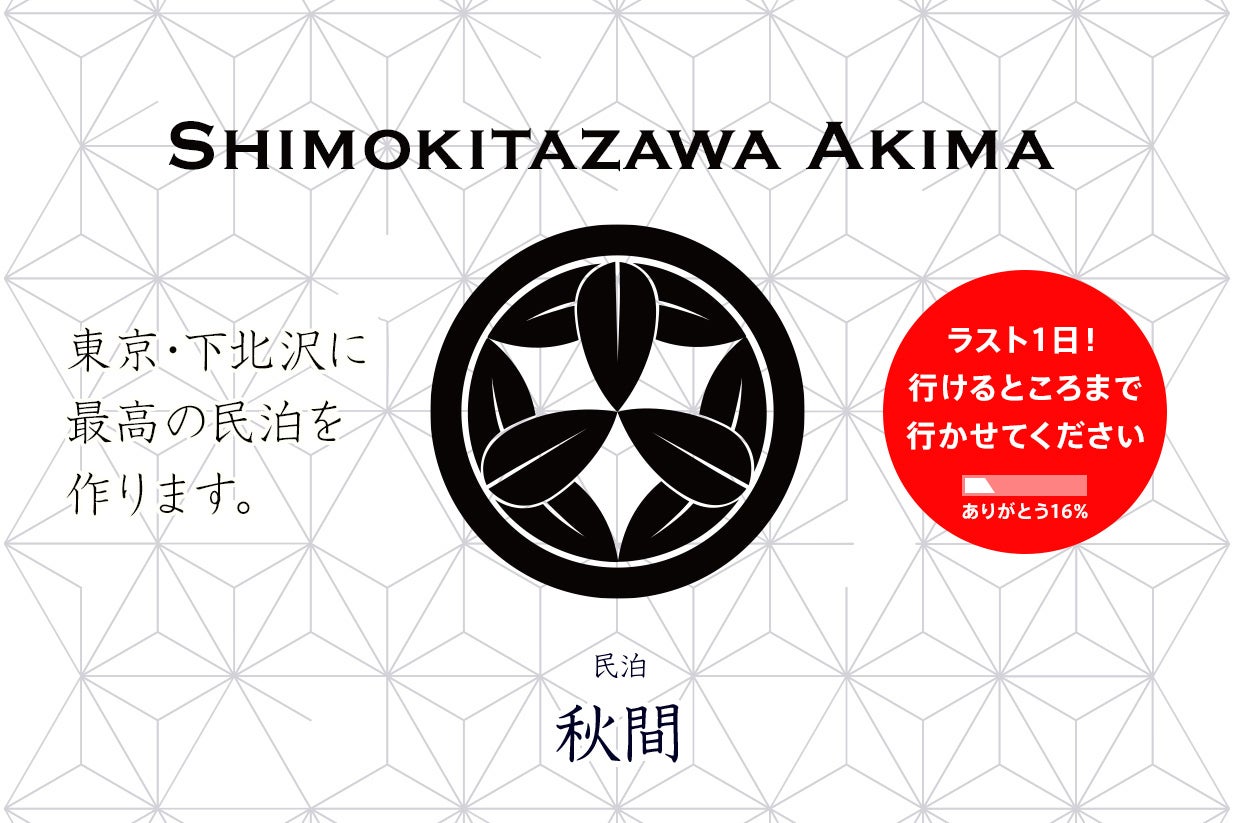 ついに残り1日になってしまいました。ホントはまずお礼を言いたいのですが、結構長くなりそうなので、初めての方や、考え中の方のためのリンク集からスタートさせてください。残り1日。どうぞよろしくお願いいたします。行けるとこまで頑張って行きたいです。是非支援をお願いいたします。【読んで欲しい記事】■プロジェクト本文■(個人的)民泊史① 2008-2014■(個人的)民泊史② 2014-2016■(個人的)民泊史③ 2016■(個人的)民泊史④ 2017■(個人的)民泊史⑤ 2018■世田谷区住宅宿泊事業検討会【リターンの説明】■リターン1:お礼状■リターン2:下北沢案内■リターン3:オープニングパーティ■リターン4:2階民泊1泊利用券■リターン5:2階1泊券+下北沢ガイド■リターン6:1階1泊券■リターン7:1階1泊+ガイド■リターン8:交流型民泊プライベートセミナー■リターン9:下北沢1ヶ月滞在券■追加リターン:手ぬぐい/漆喰ワークショップ/リラクゼーションオイルマッサージ/1泊宿泊券+ サウンド・ヒーリング体験 60分で、こんなところですみません。本当はまず、いろんな形で僕のことを応援してくれている皆さんにお礼を言いたいところだったのですが、あと1日で少しでも多くの仲間を集めたくて、後回しにしちゃいました。。凄い失礼な奴ですよね。でも、せっかく皆さんのお力を貸していただいているプロジェクト、何とか少しでも成功に近づけたいです。何卒お許しください。。前にも言ったかもしれないんですけど、こうやってクラファンをやっていると、ついつい数字を見ちゃうんです。何円とか、何%とか。で、数字だけ見ると、このプロジェクト全然うまくいっていないんですよ。でも、ホントはそんなこと全然なくて。いろんな人がいろんな形で力を貸してくれているのがすごく嬉しくて。特にここ数日いろんな人が応援のメッセージくれたりSNSでシェアしてくれたり、本当にありがたく思っています。ちゃんと個別にお礼伝えたいんですけど、まだちょっとその余裕が無くて。すみません。でも、ホントありがとうございます。てか、みんな、自分にはもったいないような言葉かけてくれてるんで、結構照れくさくて。みなさん、オレホント生意気なヤツで、うまくお礼とかホント言えないんですけど、後押しして頂いてありがとうございます。ラスト1日、どんな結末になるか、そして同時にどんなスタートが切れるか、楽しみにしています。でも、やっぱ少しでもいいスタート切れるよう、もう少し力を貸してもらえると嬉しいです。少しでも理想に近い位置から初めて、目指す場所に近づいていきたいです。秋間、いい場所にしていきます。ラスト1日、どうぞよろしくお願いいたします!