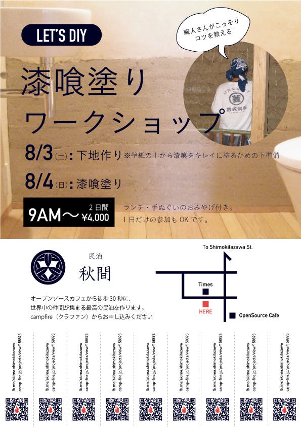 しっくいワークショップ、ご近所のオープンソースカフェで案内ポスターを掲示させて貰いました。ご近所さんから参加してもらえたらいいな。他にも貼ってもらえそうなところ、実際に来てくれそうなところ、考えてみようと思います。