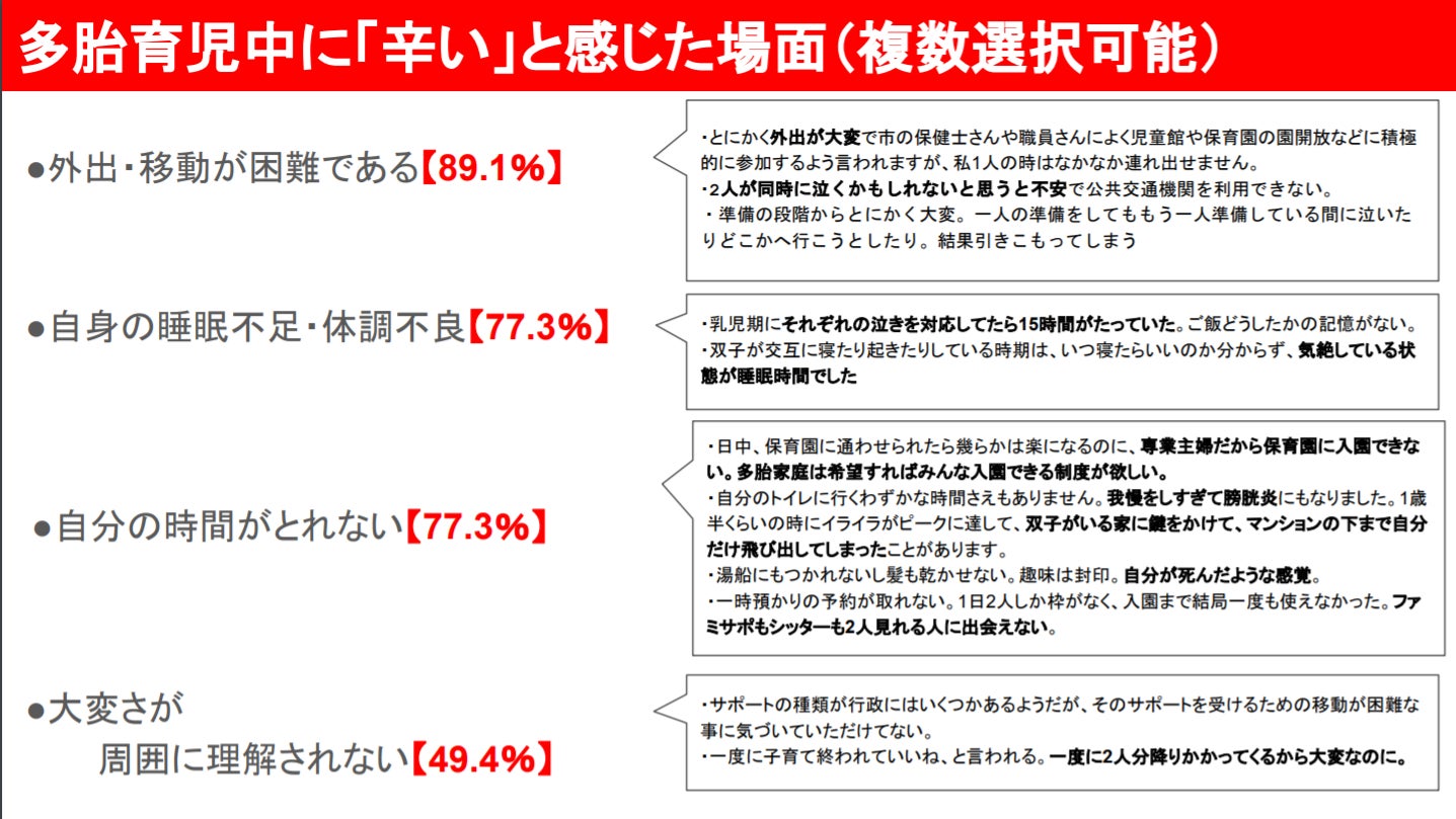 多胎育児のサポートを考える会が出した調査結果でも、移動の困難さが明らかになっています。
