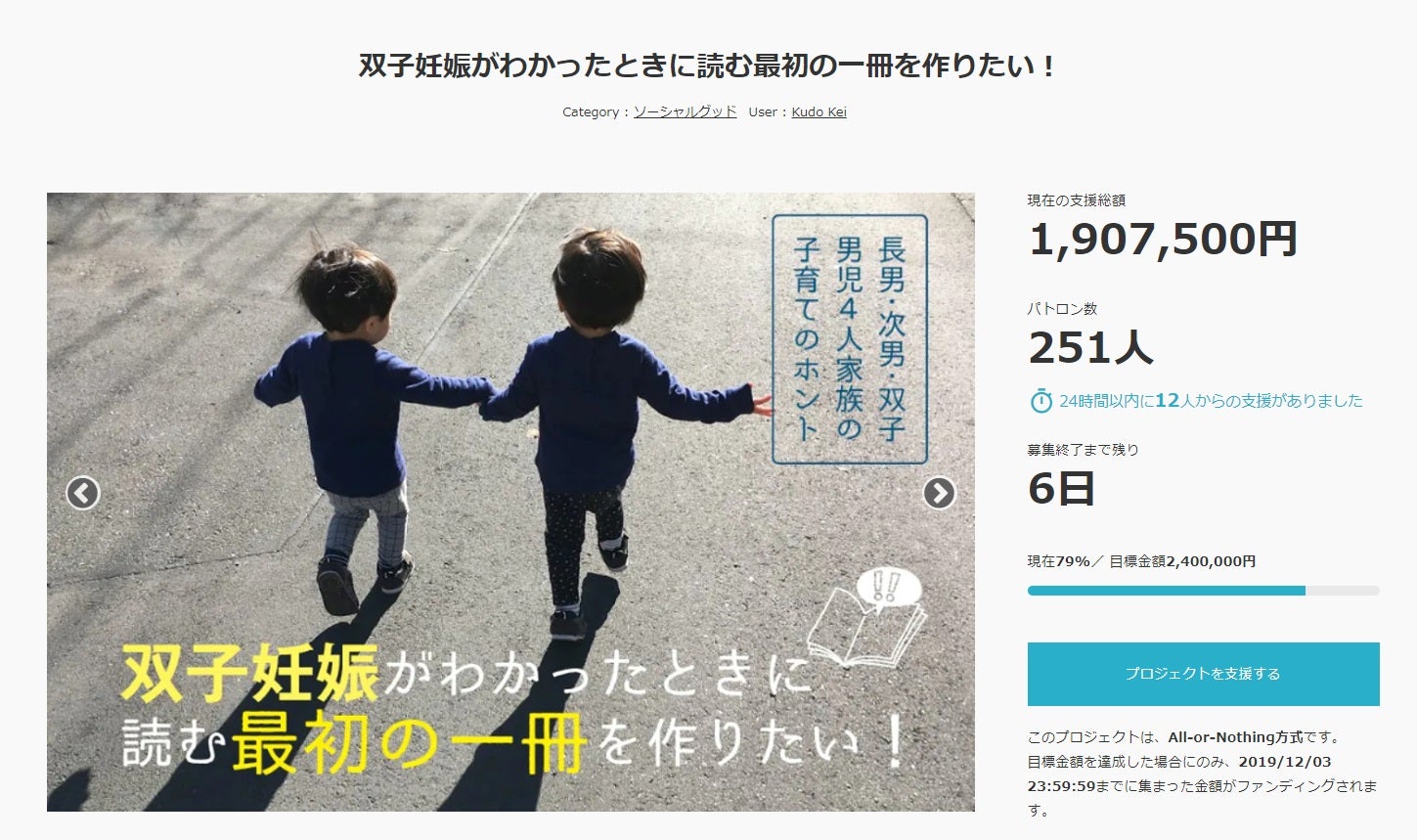 今回の双子本チャレンジは「All or Nothing」方式という、目標金額に届かなかったら、これまで応援いただいた金額が皆様のもとに返される形となっています。