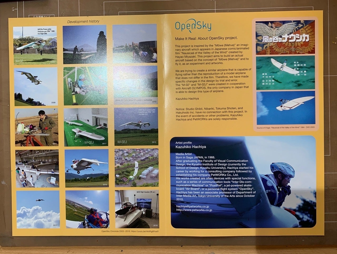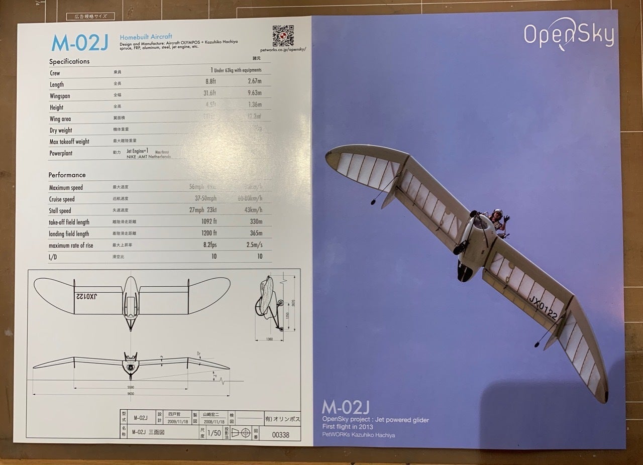 ひとつはA3見開きのチラシで、これは基本的な機体の情報やプロジェクトの説明、今までの開発ヒストリーなどをまとめたものです。(テキストはすべて英語)。こちら、2年前にもほぼ同じような内容で作ったのですが、今回情報をアップデートしたり、A3見開きになるようサイズを調整しました。