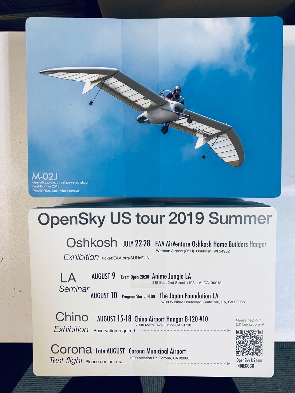 もうひとつ、A5裏表のフライヤーも作りました。こちらは完全に今回のツアーのスケジュール告知チラシです。表面は機体が飛んでいる写真、裏面は今回のツアースケジュールです。今、米国向けにやっている、Indiegogoのリンクなどもいれています。