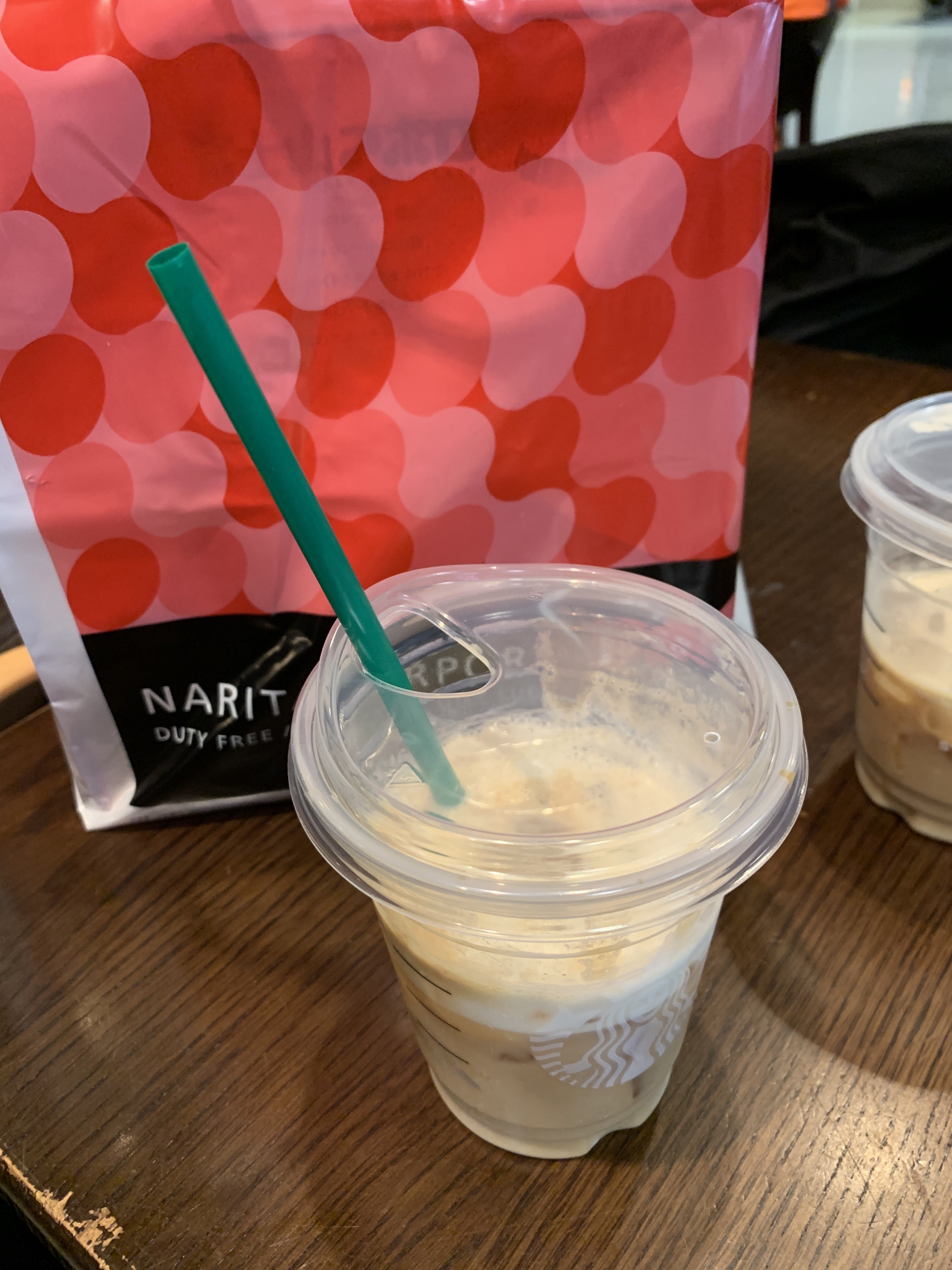 写真は空港のスターバックスです。アイスのキャラメルマキアートが日本のより甘い気がします。
