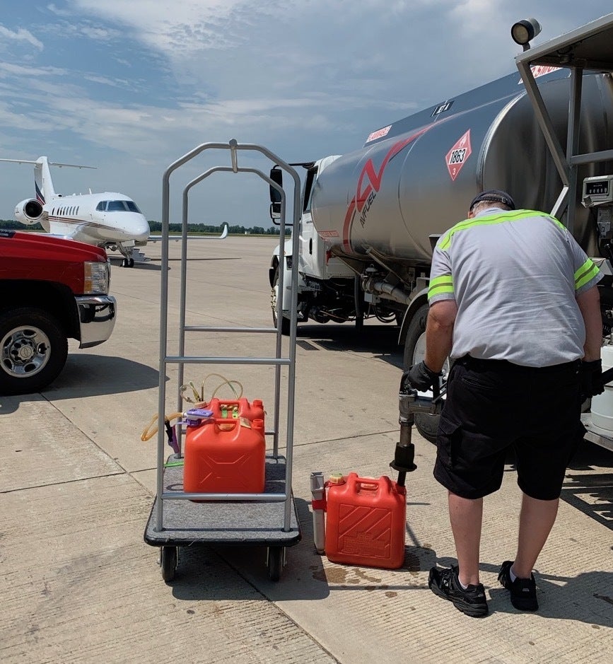 本来はビジネスジェットに燃料を入れる燃料車から、日本で販売されている灯油タンクにジェット燃料を入れるというシュールな光景。