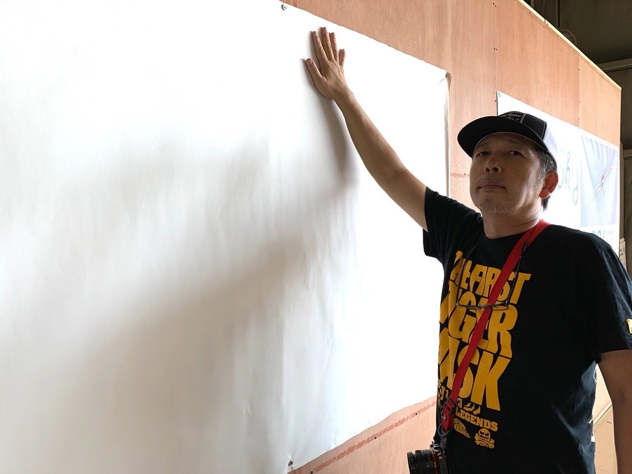 寺田克也さんは昨日の夕方オシュコシュに入ったので、今日からのエアショー参加になります。今日は朝からキャンパスを壁に貼るところからはじめました。
