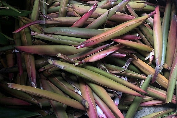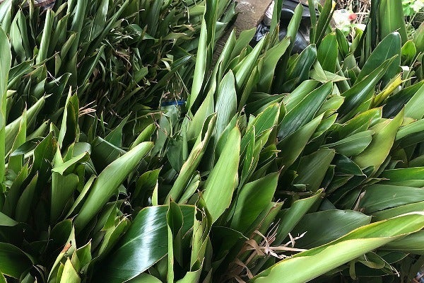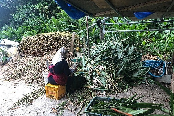 刈り取った葉をトラックに載せ運びます。葉からのみ精油は採油されるため葉、茎、花に分類されます。分類する作業はすべて手作業となりここが一番手のかかるところとなります。月桃の良い香りが辺り一面に漂っています!