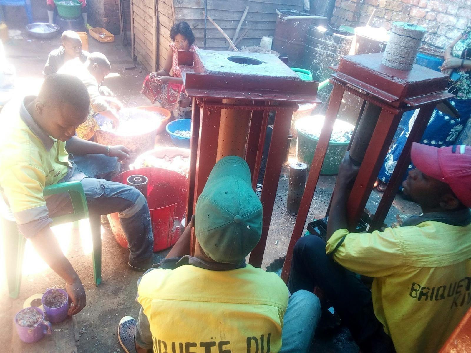 ウガンダから輸入した機械で圧縮し、ブリケットをつくる様子