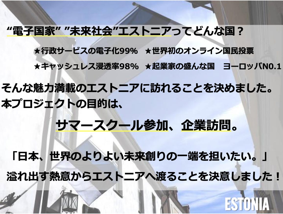 エストニアという国は行政サービスの99%が電子化され、24時間年中無休で利用することができます。これらのサービスの基盤にはブロックチェーンが使われています。もちろん同国では、先進的な技術が他にもたくさんあり、またスタートアップも盛んです。しかしこれらの情報は実際に身を持って感じて得られたものではありません。よりよいサービスを世界に還元するため、いつか私達が自らエストニアを訪れる必要があると感じていました。そんな中、今回エストニア大使館の方からタリン工科大学でのサマースクールがあるとの情報をいただき、絶好の機会だと思い参加を決意しました。そして、すでに面接には合格し参加することが決まっています。皆様にはこのサマースクールへの参加のためにお力添えをいただきたく今回のプロジェクトを立ち上げました。