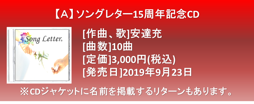 7、キャンペーンソングCD1枚+15周年ライブのチケット1枚+CD名前掲載+安達充が出張します(講演、ライブから選択)+15周年ライブの打ち上げご招待 100,000円