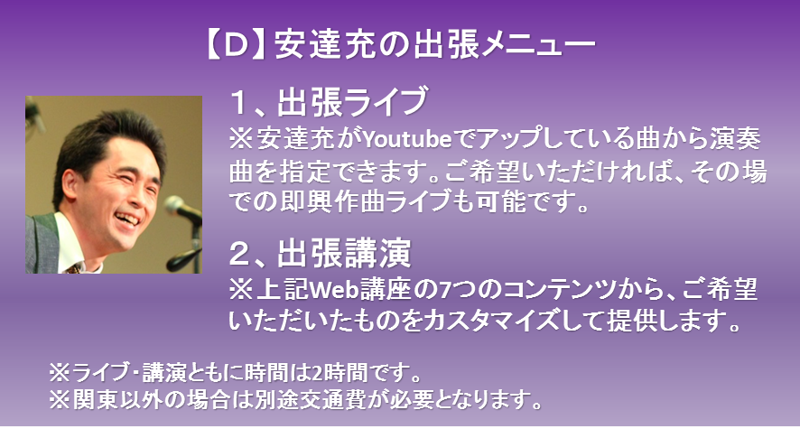 ※出張講演、出張ライブ(2時間)はお選びいただけます。交通費は別途必要となります。