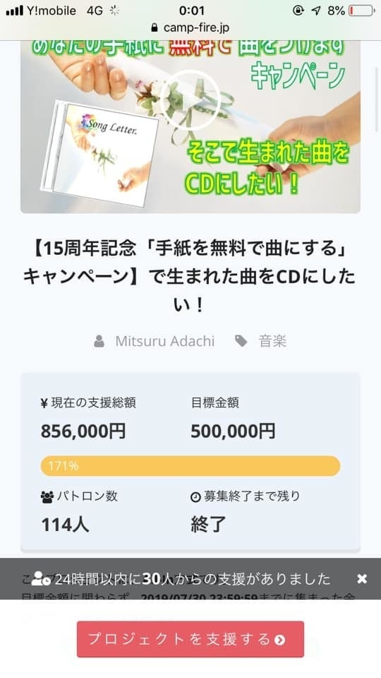2019/07/31 10:07昨日クラウドファンディングが終了しました。 最終的に、114人の方から856,000円(171%)ものご支援をいただきました。 想定よりもはるかに大きな応援をいただき、本当に感謝しています。 特に、今日1日だけでも30人の方からの支援を受け取らせていただきました。 たくさんの方が自発的にシェアをして拡散してくださいました。 一人ではできないことを、多くの方の力で達成させてもらったと感じています。 いただいた応援のお気持ちを大切に受け取って、CD、ライブ、web講座などのリターンを通してしっかりとお返ししていきたいと思います! まずは御礼とご報告まで。 本当にありがとうございました!! もっと見る