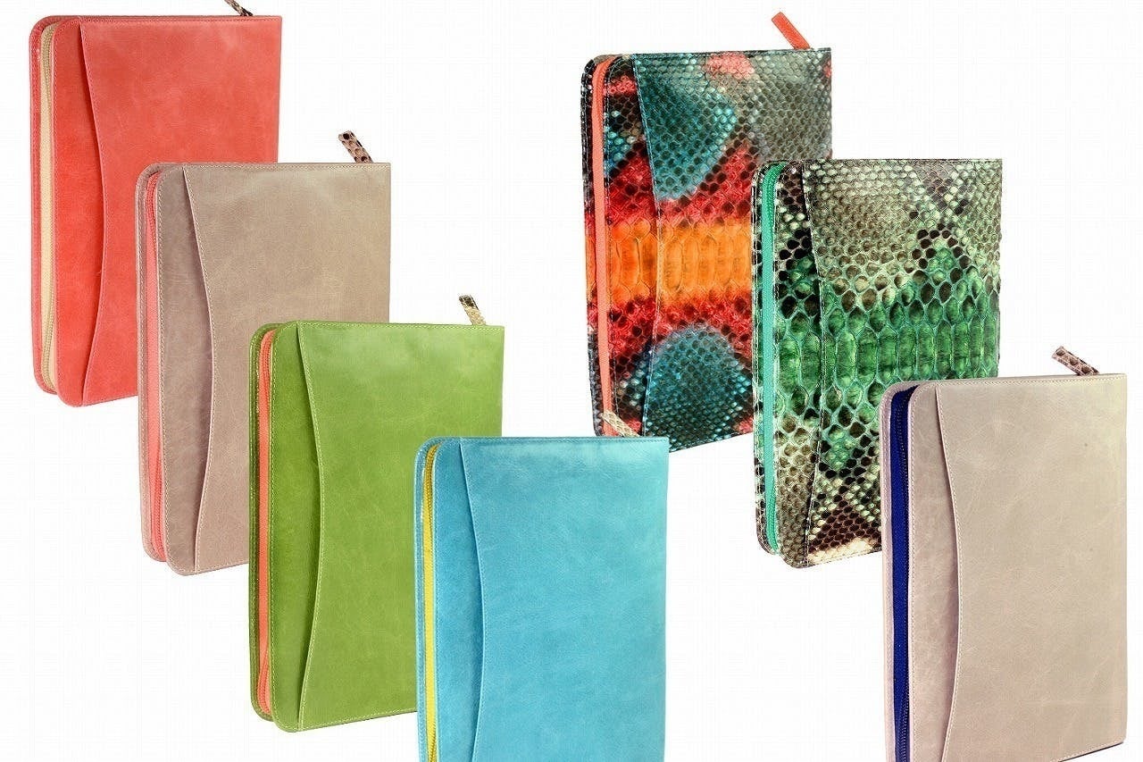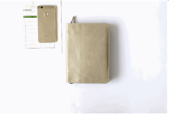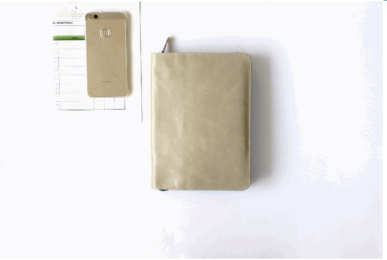 システム手帳のようにリングはついていないので好きなA5ノートが差し込め、スマホや資料を痛めることもありません。そしてなによりも金属を使わないので柔らかで、持っているだけで手にしっとりと馴染みます。詳しくはこちらをご覧ください。
