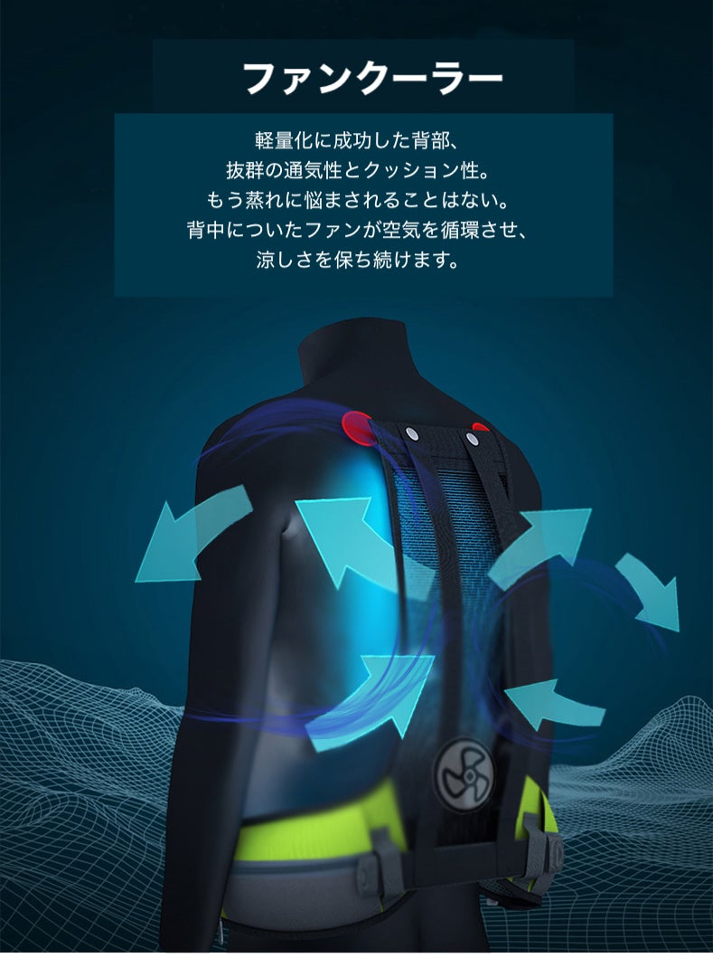 背部についた扇風機(ファンクーラー)が通気性を保証します。