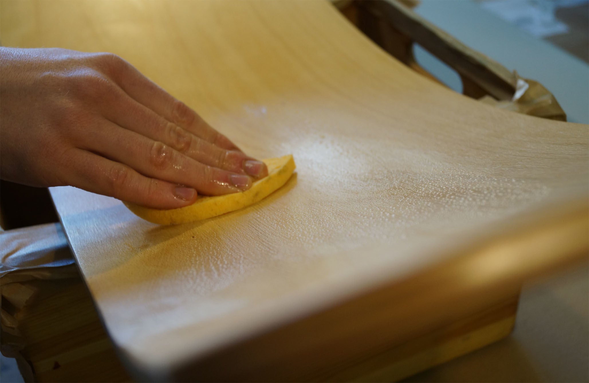 表面を綺麗に仕上げた後にオイルまたはラッカーを練り込みます。