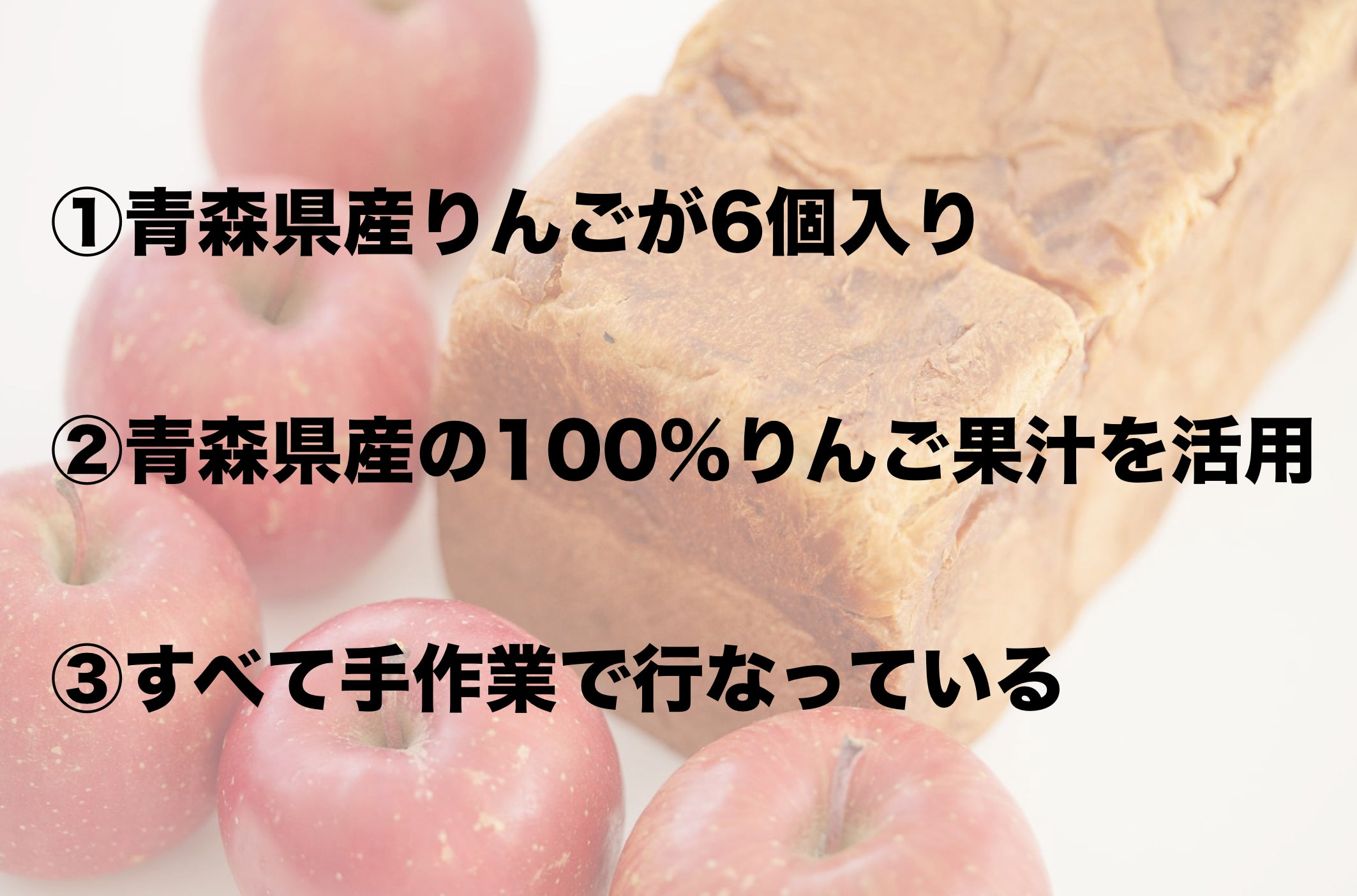 青森産のりんごを1.5斤の中に5個以上入れ、水の代わりに青森産の100%りんごジュースを活用、他の食材などもこだわりの商品を取り寄せ、それらをすべて手作業によって丁寧に組み合わせ、贅沢なりんごギフトを心を込めて作りあげています。