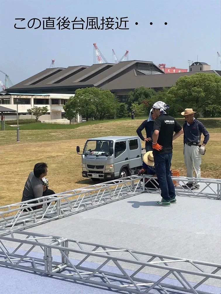 昨年は、皆さんからご支援いただいた資金を元にステージを拡張。実はステージは組みあがっていました。しかし、ここにアーティストさんが立つことはなく、台風が来る前にステージは撤収となりました。