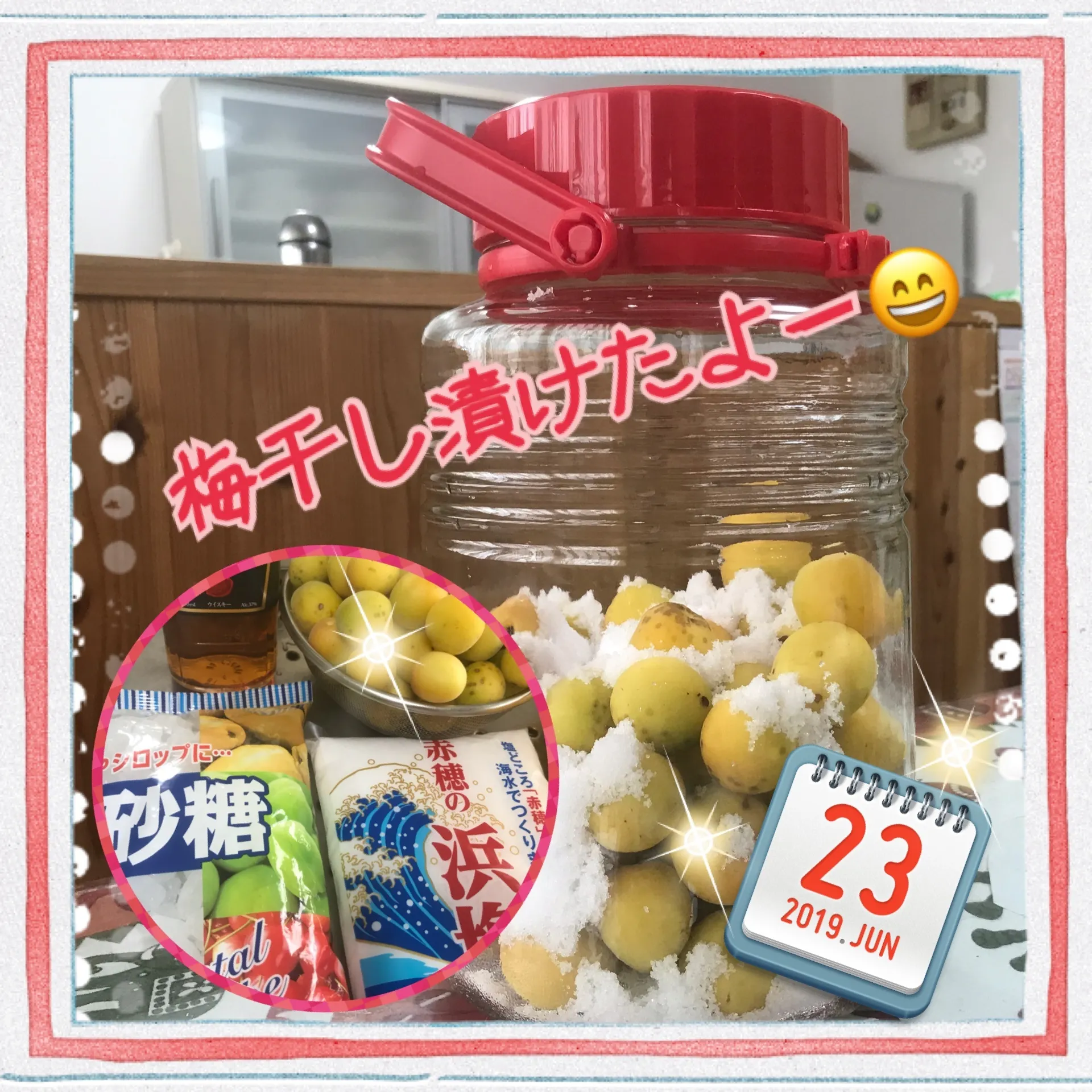 今年の梅で、梅干し&梅酒を漬けました。梅酒はホワイトリカーとウヰスキーで 飲み頃は1年後?味見は4ヶ月後くらいかな?