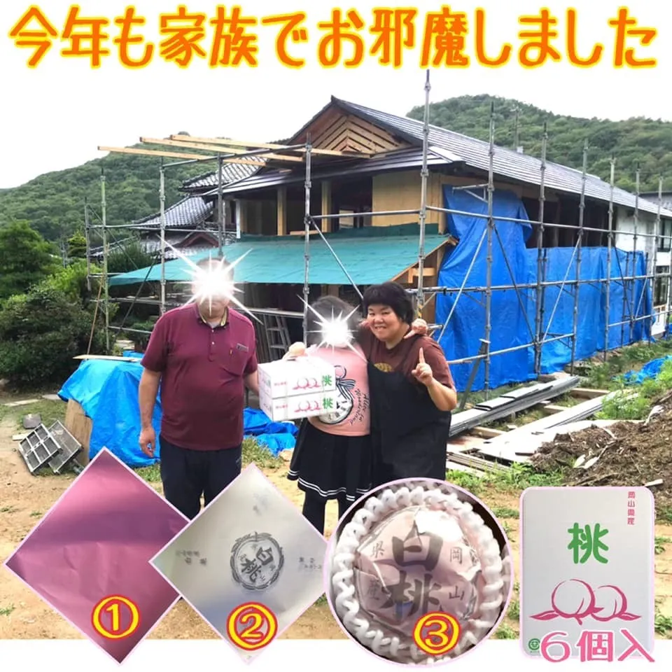 桃を①のピンクシートで包むんですが桃の向きがあるので注意②のシートで包みます③のクッションを被せて箱に梱包です。