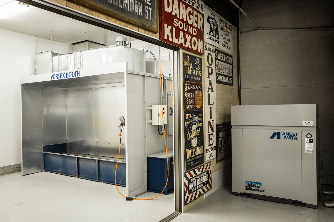 大型な装置のため、都内の導入例は大変珍しく、これにより小さな制作物はもちろん、大型バイクほどの大きさのものまで大小関係なく塗装することが可能となり、作業環境を一気に飛躍させてくれるものです。
